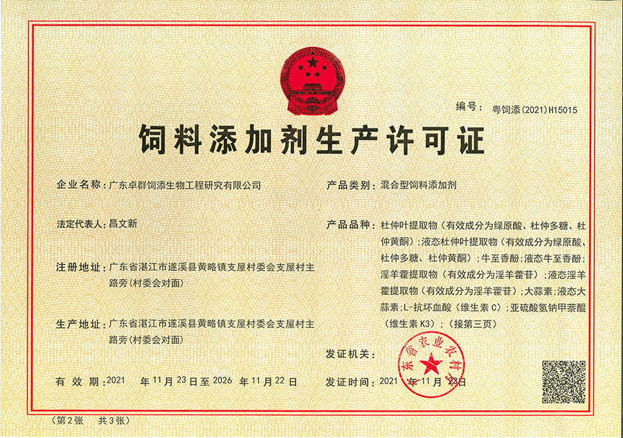 营业执照 饲料添加剂生产许可证1 饲料添加剂生产许可证2